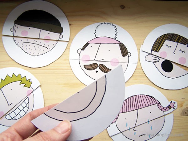 ¿Y si preparamos un puzzle muy sencillo? Cortando unos platos de cartón desechable por la mitad y decorando cada parte con diferentes caras (algunas con la parte superior, es decir ojos y nariz, y otra con la boca) podemos crear unos puzzles para armar y desarmar caritas que expresen diferentes emociones.